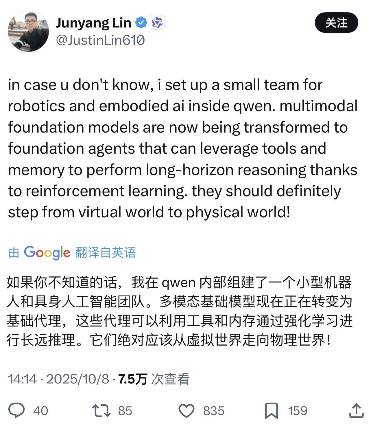 智东西10月9日报说念,昨日,阿里通义千问谎言语模子负责东说念主林俊旸在酬酢平台发文称,阿里通义里面已诞生“机器东说念主与具身智能团队”。