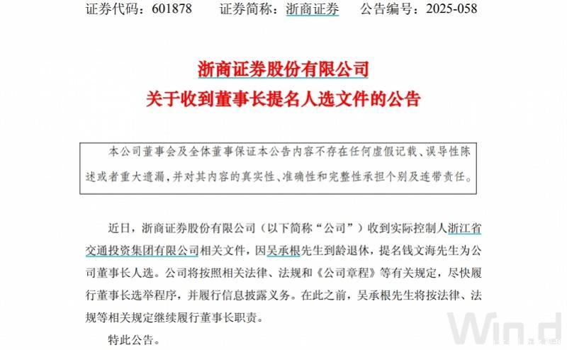 10月15日盘后,浙商证券(601878.SH)公告称,公司近日收到推行限定东谈主浙江省交通投资集团有限公司(简称“浙江交投集团”)估量文献,因吴承根到龄退休,提名钱文海为公司董事长东谈主选。