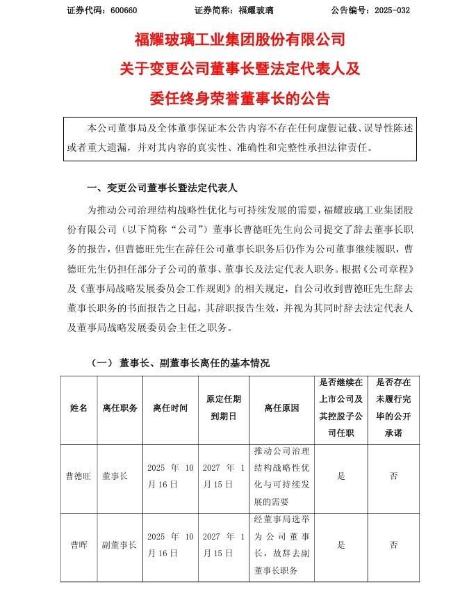 10月16日晚间,福耀玻璃闪现公告称,公司董事长曹德旺向公司提交了辞去董事长职务的证实,在辞任公司董事长职务后仍四肢公司董事不绝履职,并仍担任部分子公司的董事、董事长及法定代表东谈主职务。同期,公司选举曹晖为公司第十一届董事局董事长,同期担任公法则定代表东谈主及董事局计谋发展委员会主任。