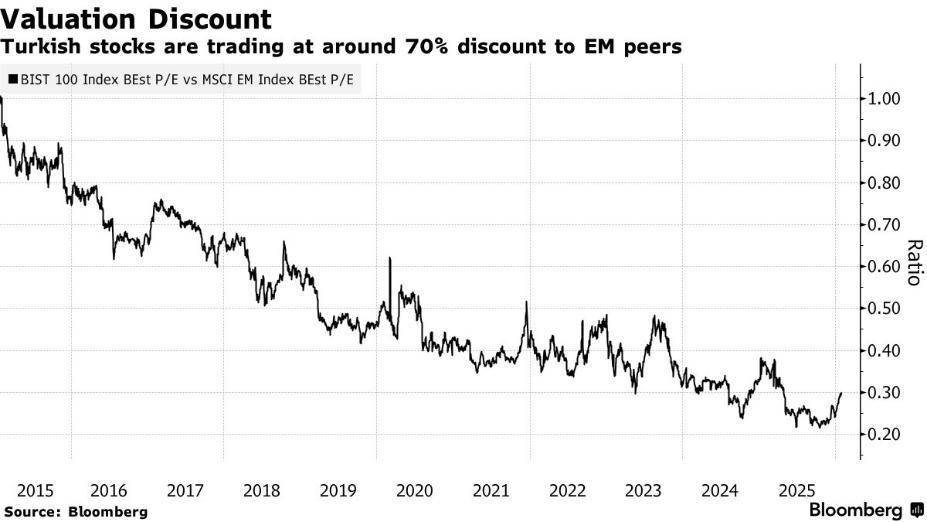 土耳其股市的往来价钱较新兴市集同类股票低约70%旧年,土耳其总统雷杰普・塔伊普・埃尔多安(Recep Tayyip Erdogan)对政事敌手的打压令投资者焦灼,导致土耳其钞票在新兴市集期待已久的反弹行情中错失良机。如今,在好意思元走弱以及投资者寻求漫步好意思国钞票确立的推进下,土耳其股市正冉冉裁汰与其他新兴市集的差距。