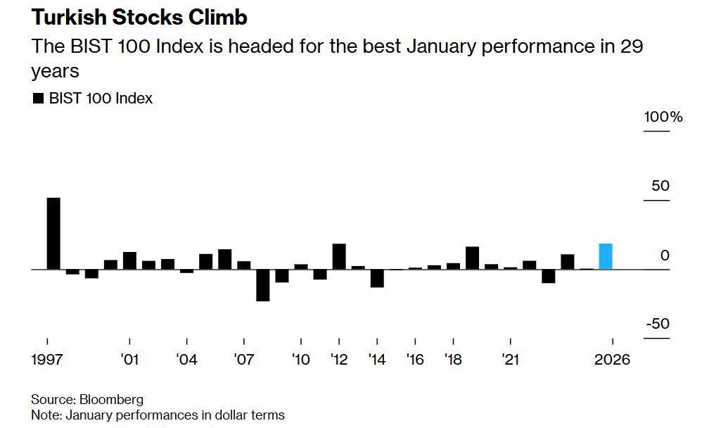 受益于新兴市集乐不雅情谊膨胀及自己估值上风,异邦投资者从头涌入土耳其股市,推进该国股市有望创下1997年以来的最好1月发扬。